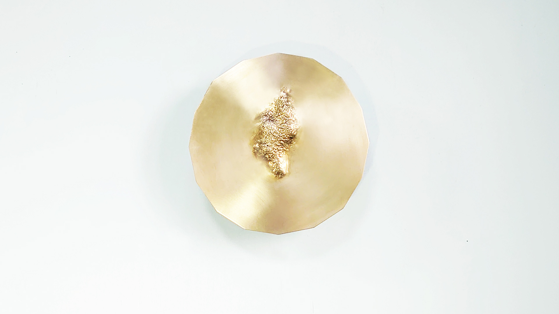 1㎜厚の薄い真鍮は、槌(ハンマー)によってかけられた力を克明に映し出す。力に抗えず空いた穴は、まるで地続きの外側に開いた風穴のようだ。外側と内側をつなぐ穴。